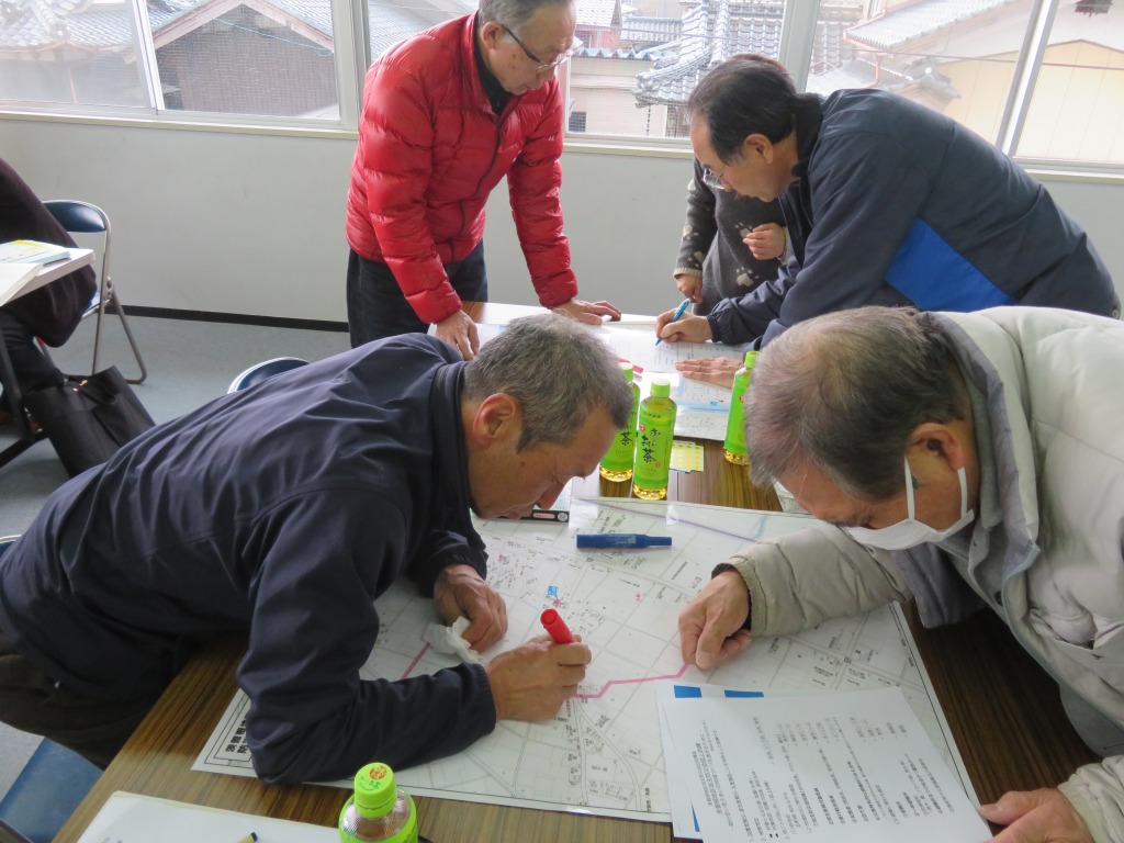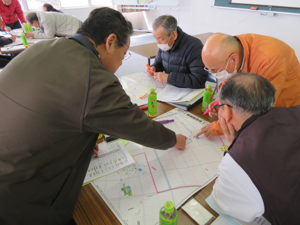 自治会ごとに分かれ、自分の自治会内の避難行動要支援者の方や心配なお宅について情報交換しながら印をつけたり、支援する側の世帯に印をつけたり、避難ルートを確認するなどを行いました。