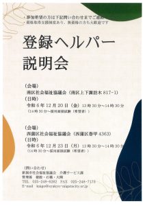 12月20日(金)、南区社会福祉協議会を会場に登録ヘルパー説明会を開催します。